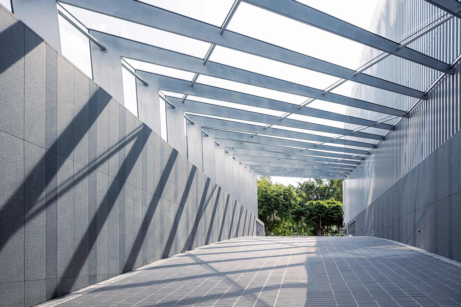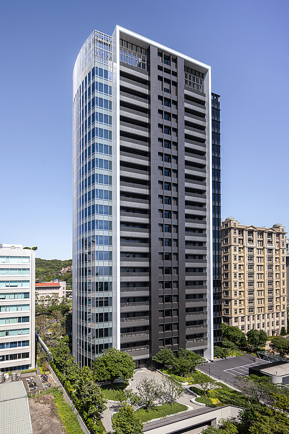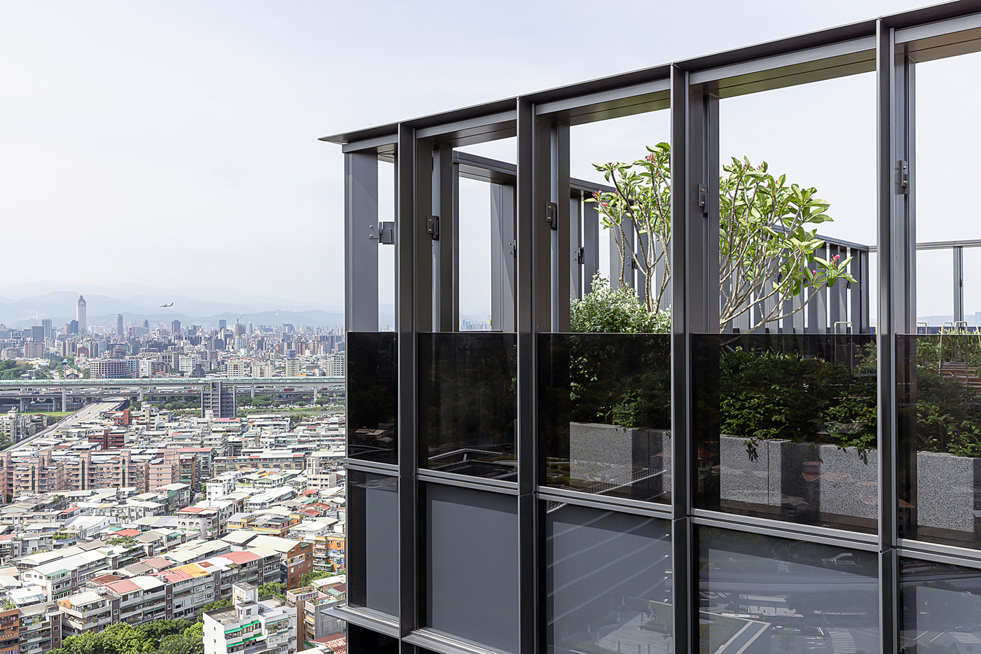 從地面層的微型森林到屋頂的天空綠洲,建築本體外牆系統則以垂直遮陽、複層Low-E玻璃構成,