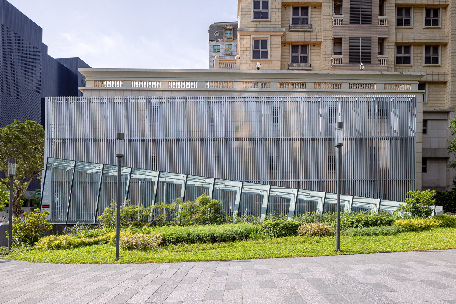 外觀東北面採弧形量體,呼應臺北表演藝術中心的球體造型,南面則採盒狀構造,