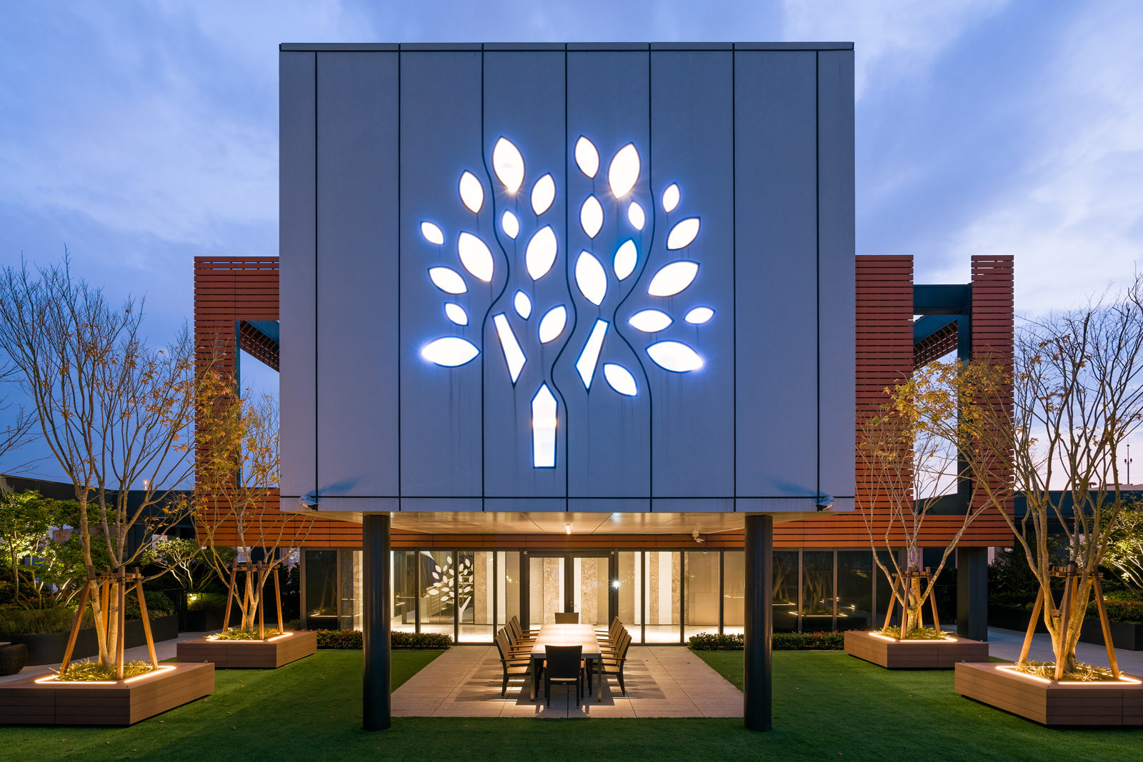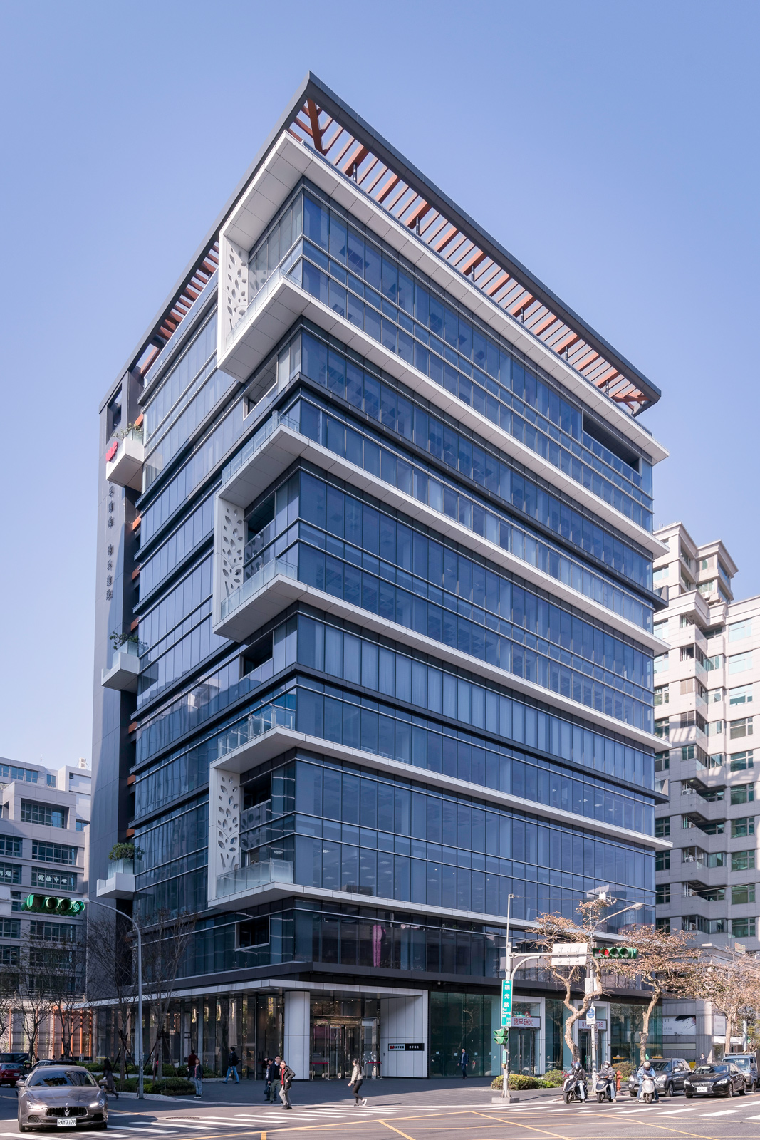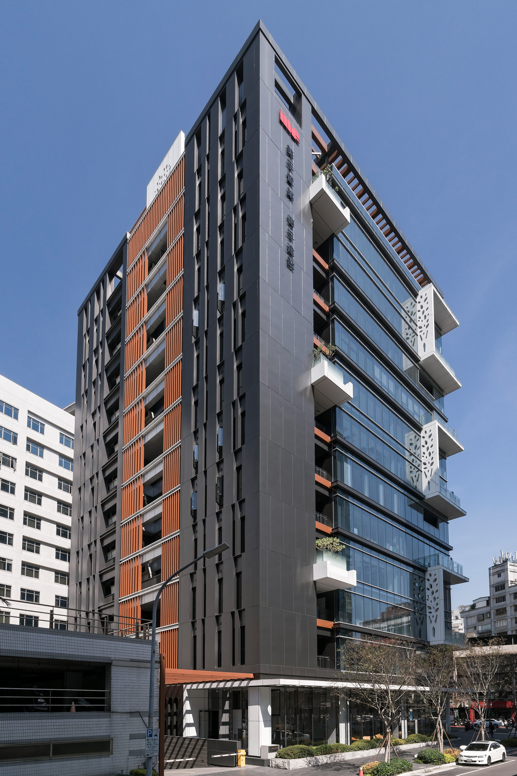 「科技之樹」作為核心原型,寄寓生命的庇蔭與滋養,以葉形遮陽板營造光影流動的一樓開放空間,並以垂直樹型遮陽板活化立面與街區關係。頂樓透空框架打造的空中花園為城市增添綠意,一座翡翠皇冠優雅而居。