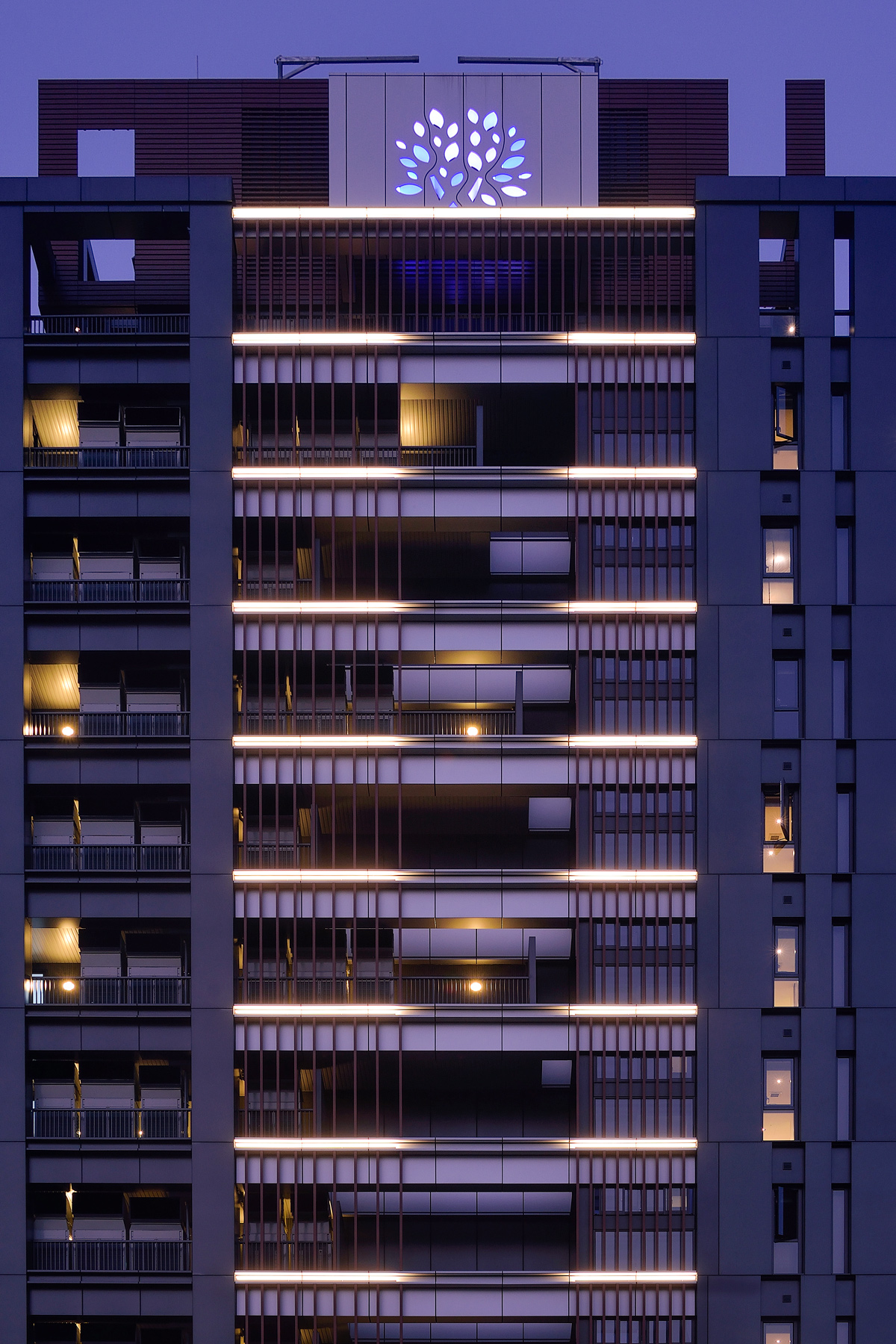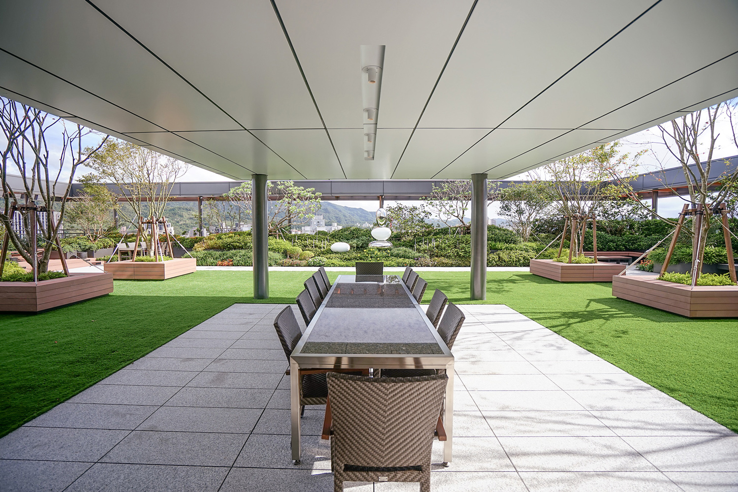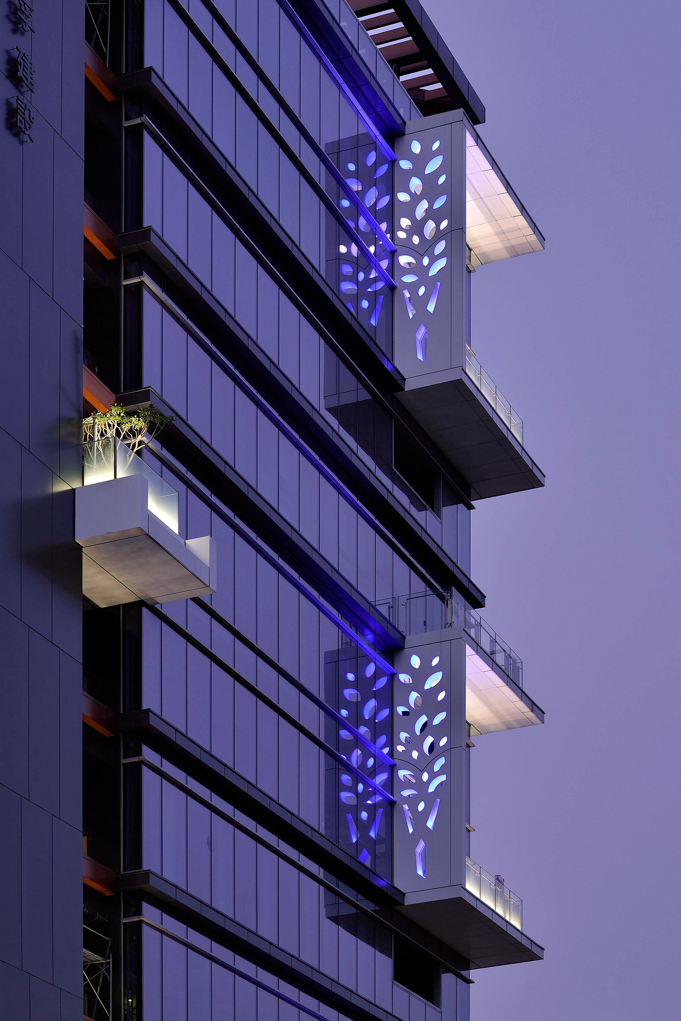 「科技之樹」作為核心原型,寄寓生命的庇蔭與滋養,以葉形遮陽板營造光影流動的一樓開放空間,並以垂直樹型遮陽板活化立面與街區關係。頂樓透空框架打造的空中花園為城市增添綠意,一座翡翠皇冠優雅而居。