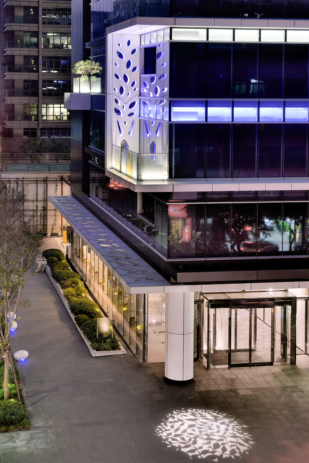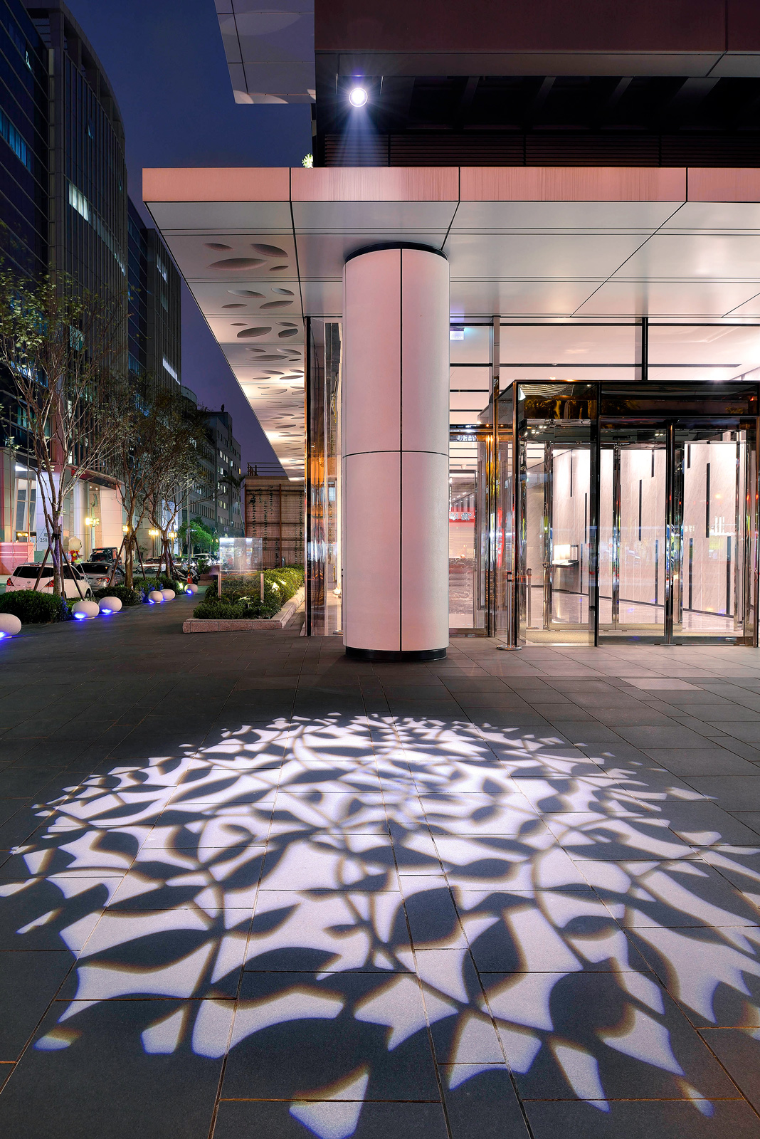 延續這份對城市的友善,入口大廳置於街角,以都市光盒打造建築與行人的開放介面。不銹鋼鏡面背板映照街景綠樹,陽光穿透葉形雨遮與大理石牆交織光影;夜幕降臨,雨遮投射的葉影覆落於廣場地面,消弭辦公大樓的冰冷印象,形成溫暖而親切的街角客廳。