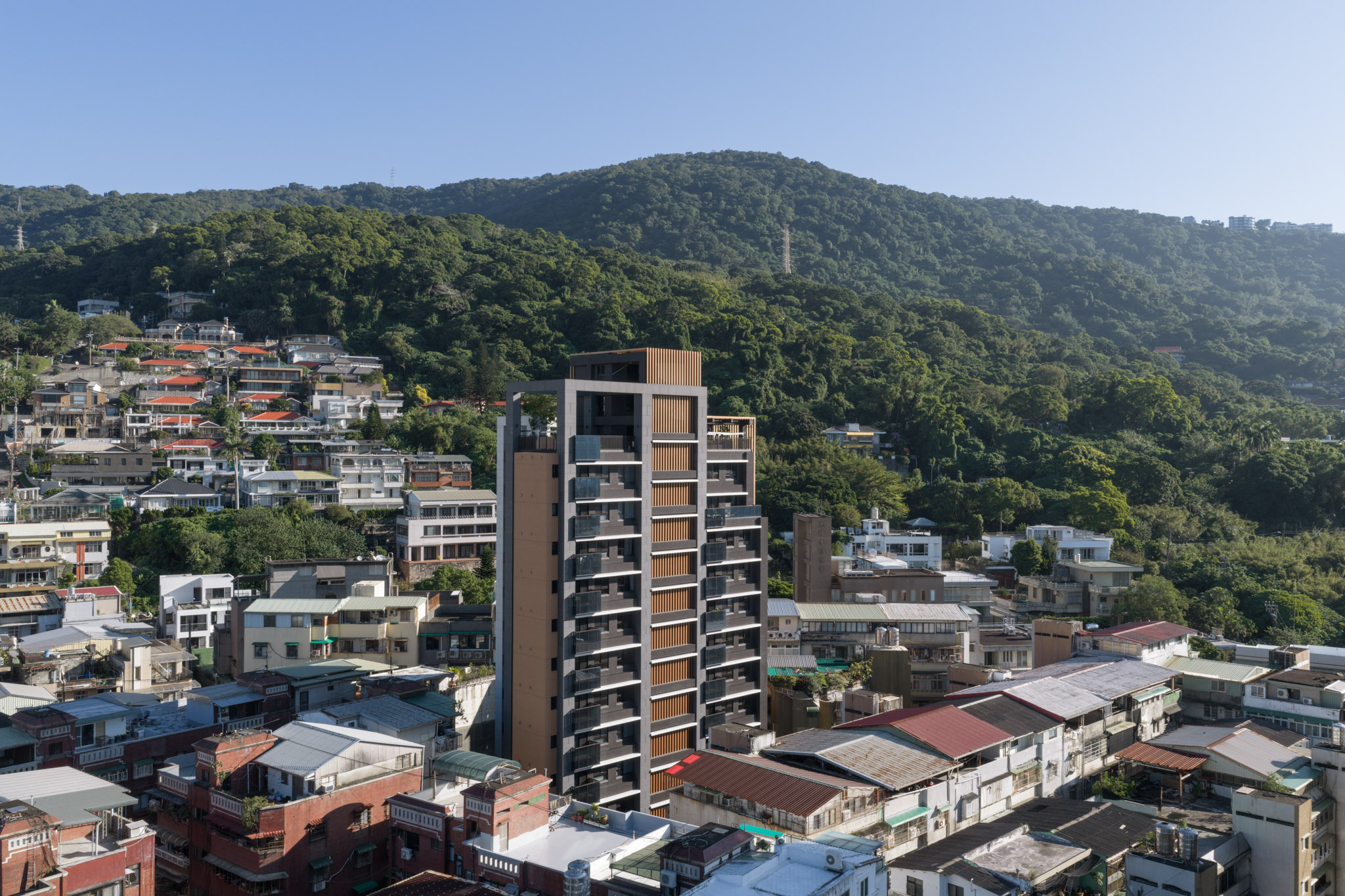 回應周圍山景,建築量體高低錯落,屋突造型框架層層堆疊,共同描繪流動的都市天際線。尤其北側量體自11樓起垂直漸退,露臺空間的節奏饒富趣味,山巒層峰延展,住戶得以眺望陽明山系。