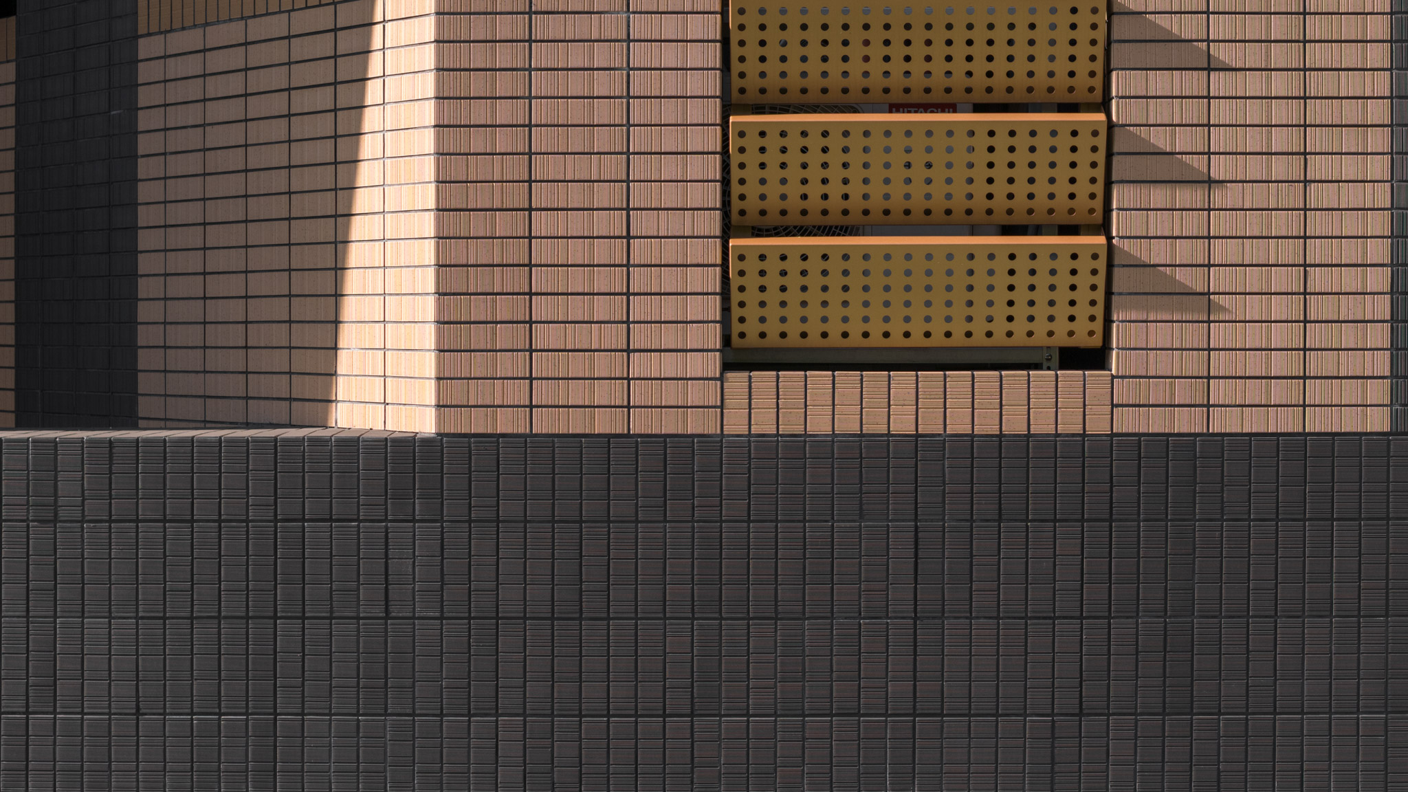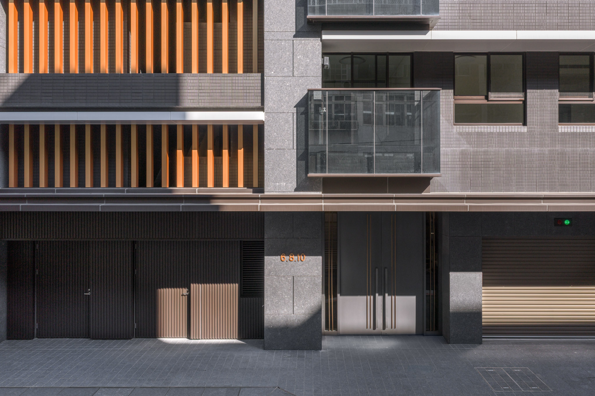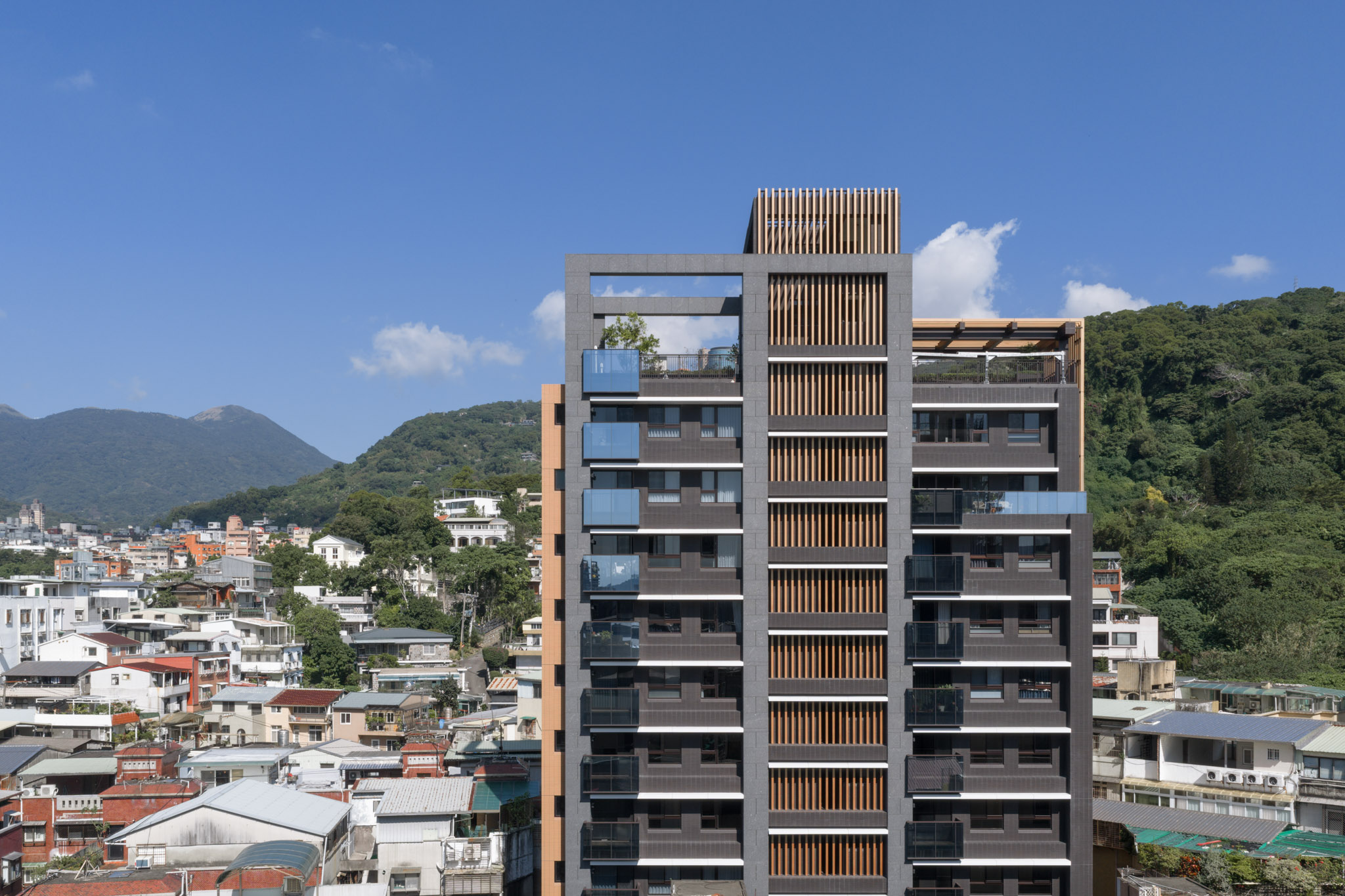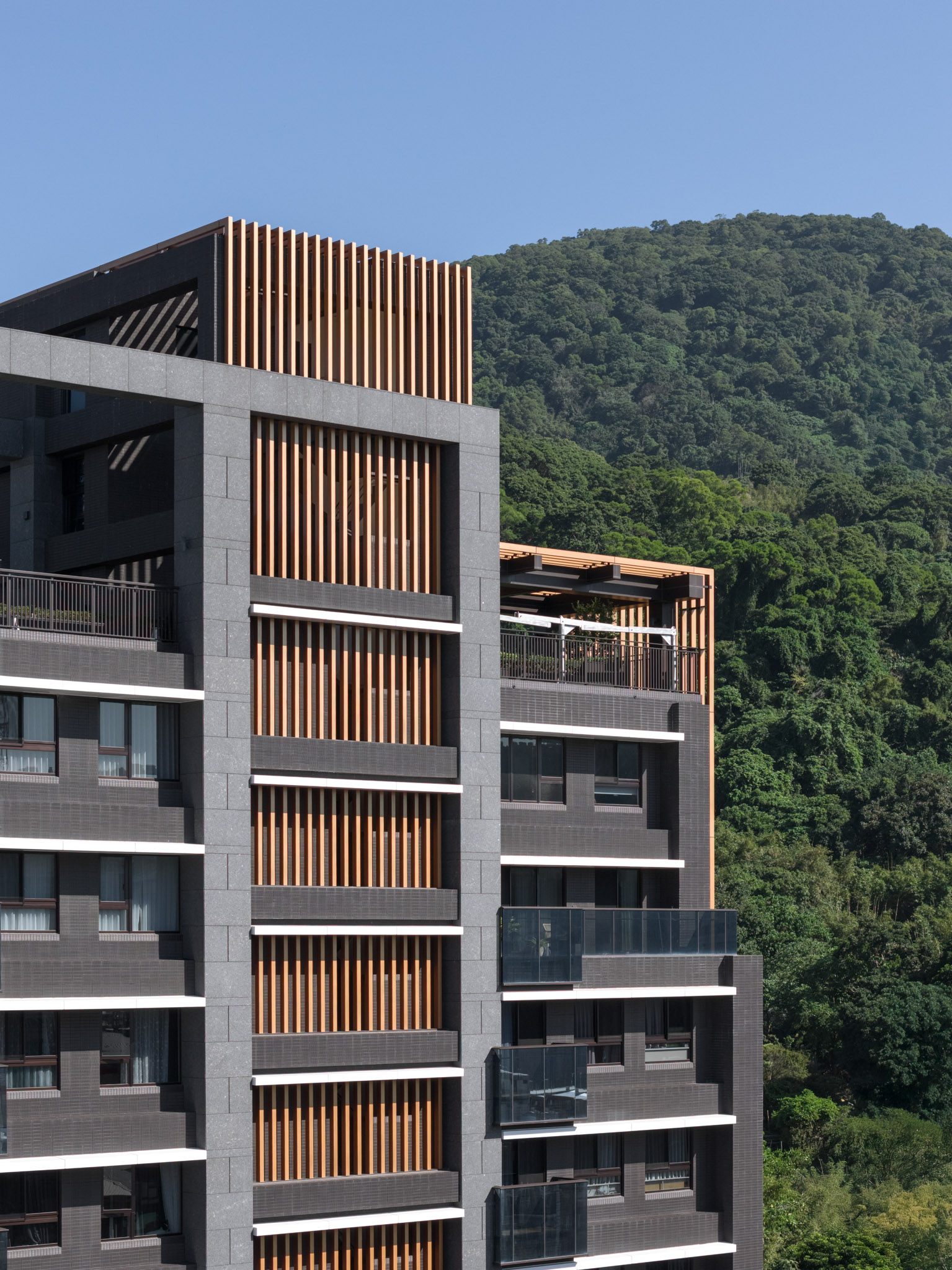 呼應「錯落山景」的設計理念,建築立面以灰色與木色為主調,石材、丁掛磚深淺相襯,搭配木紋烤漆金屬格柵,形塑多層次的垂直線條。