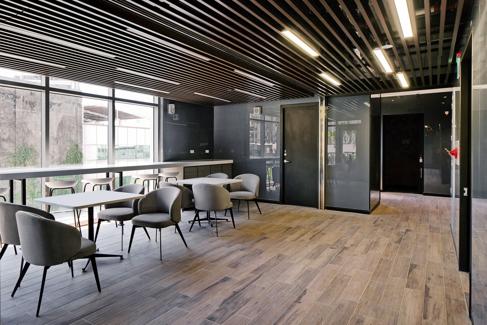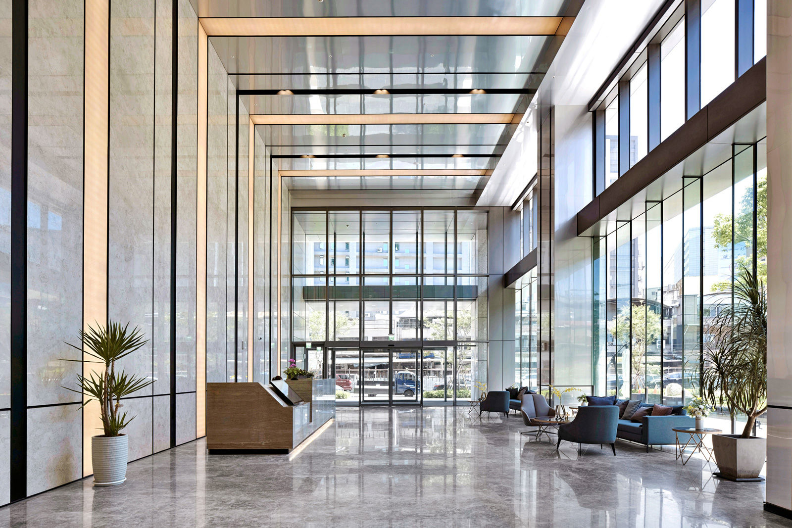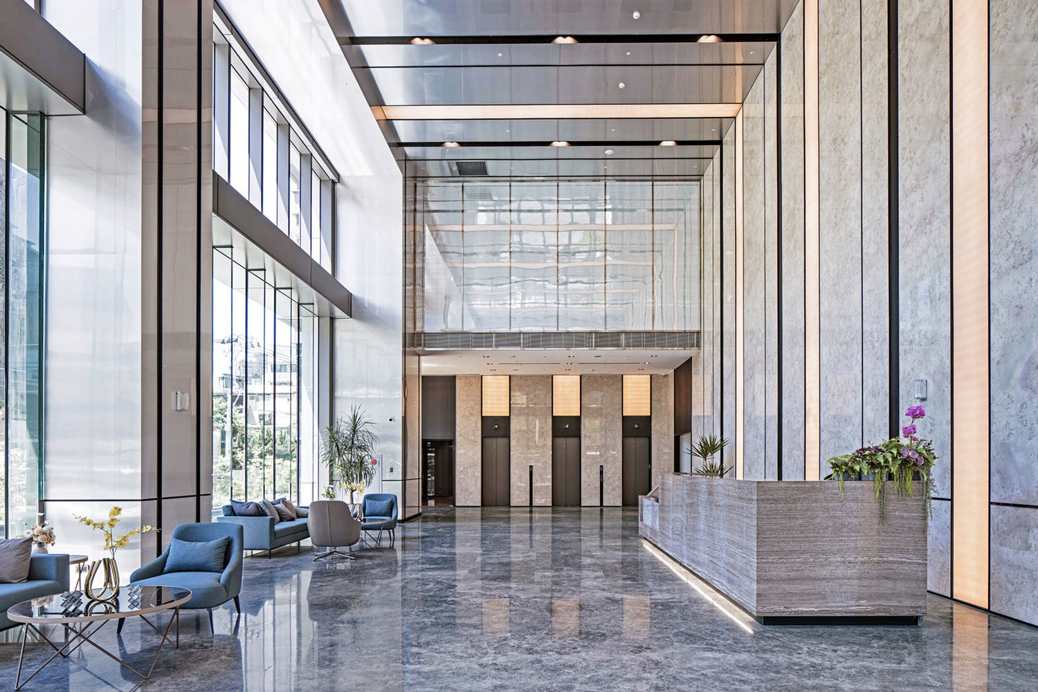 有別於廠辦大樓的厚重形象,遠雄FM1辦公大樓「輕」公設,巧托反射質感與光影,內外穿透,演繹精爽設計的一面。大廳的L型光帶與建築立面的跳躍線條融為一體,營造明亮俐落的現代科技氣息。空間主體,亦選用米色系的天然石材,搭配金屬網半透光玻璃與背打燈襯托,呈現輕盈的視覺質感。窗邊天花板,則採用金屬鋁板利用反射原理,將室外的水景、綠意引導入內,創造開闊自然的辦公體驗。