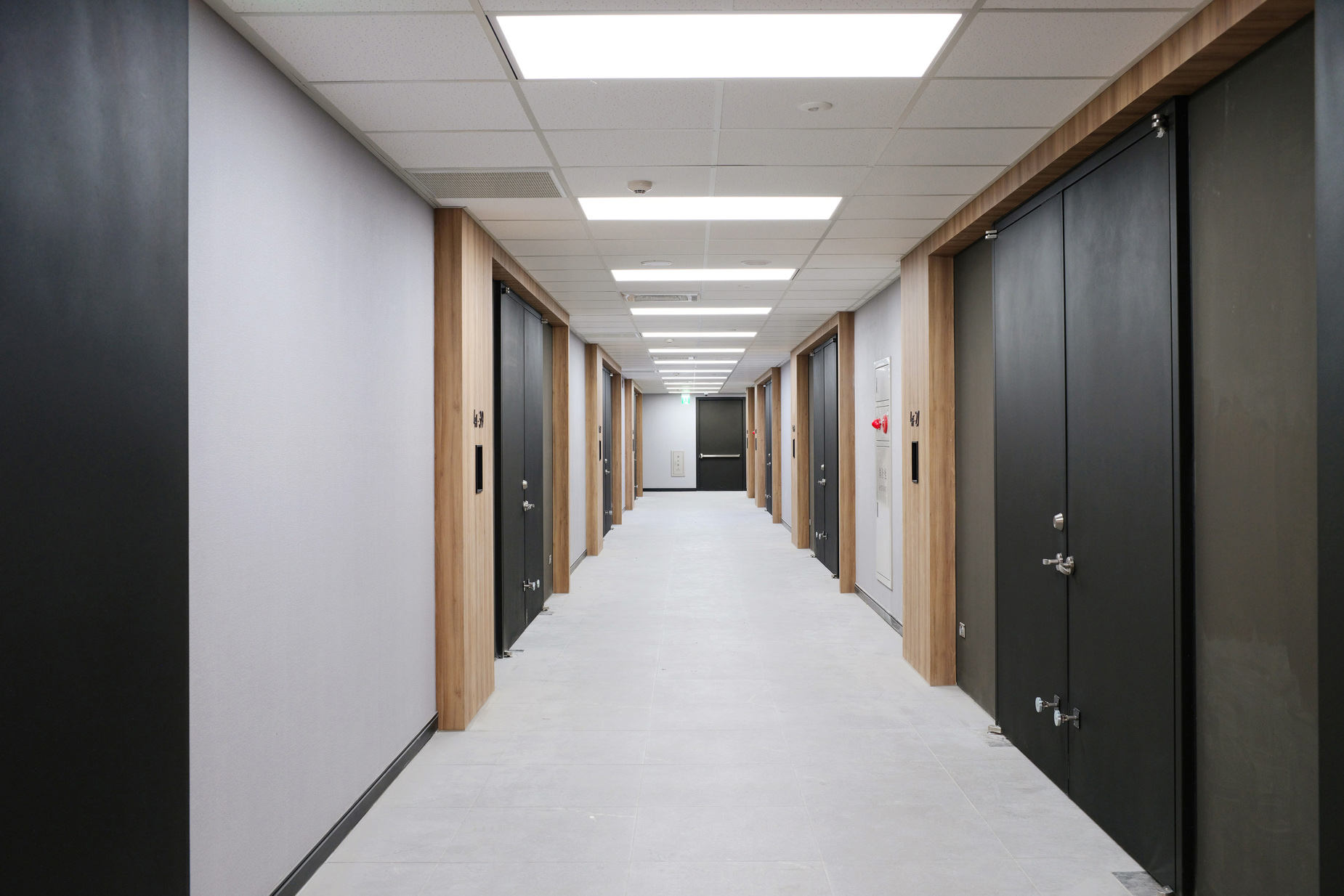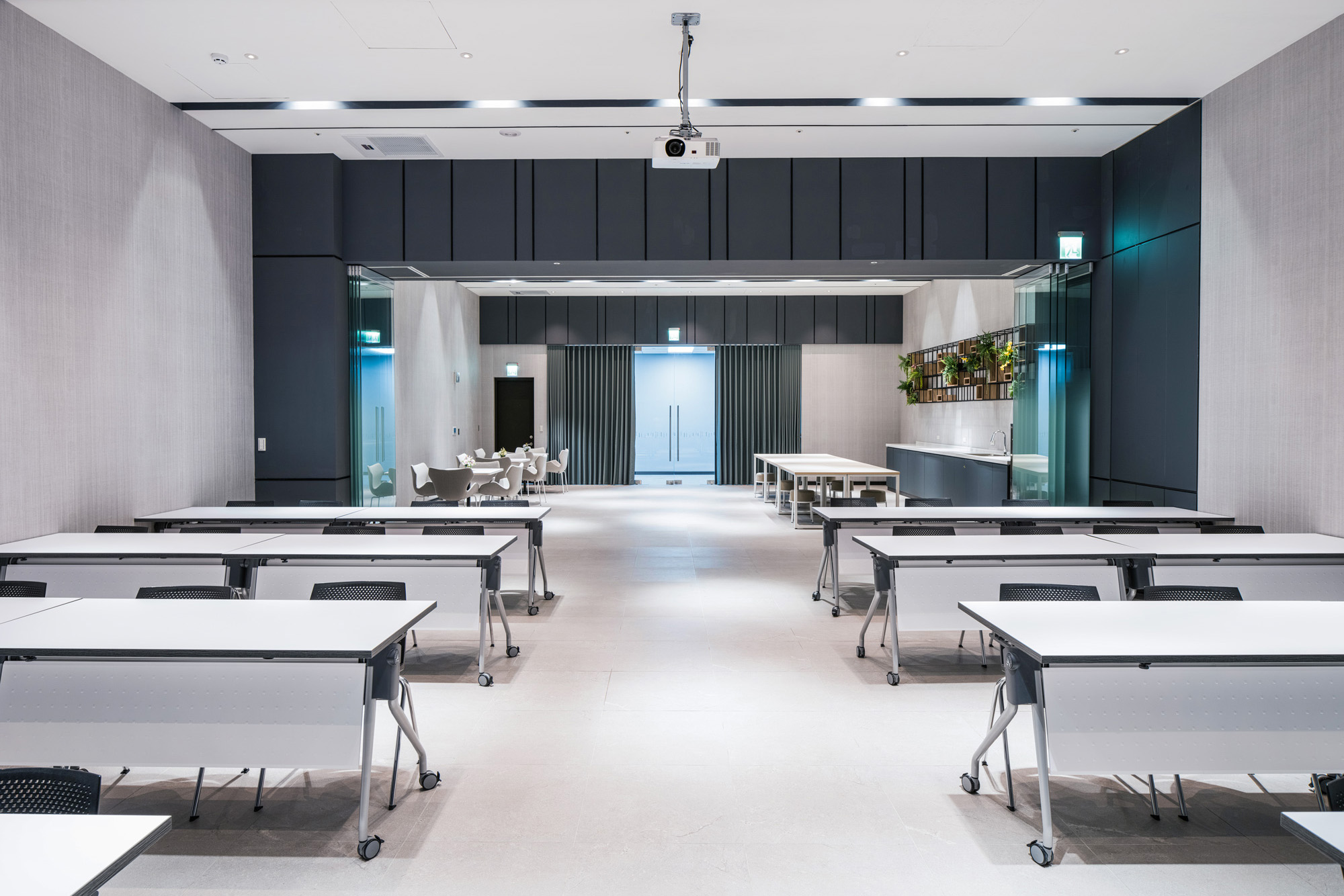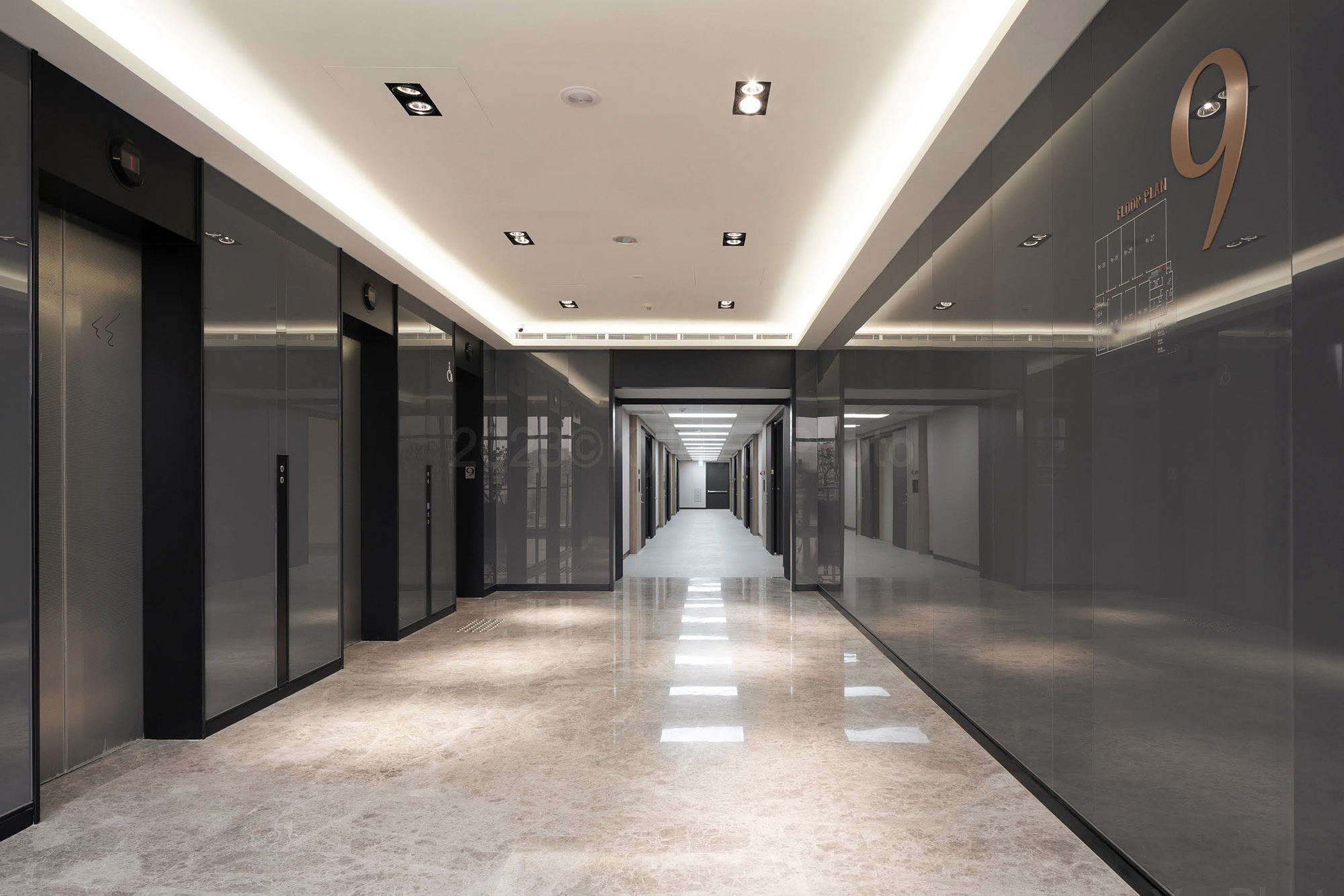 有別於廠辦大樓的厚重形象,遠雄FM1辦公大樓「輕」公設,巧托反射質感與光影,內外穿透,演繹精爽設計的一面。大廳的L型光帶與建築立面的跳躍線條融為一體,營造明亮俐落的現代科技氣息。空間主體,亦選用米色系的天然石材,搭配金屬網半透光玻璃與背打燈襯托,呈現輕盈的視覺質感。窗邊天花板,則採用金屬鋁板利用反射原理,將室外的水景、綠意引導入內,創造開闊自然的辦公體驗。