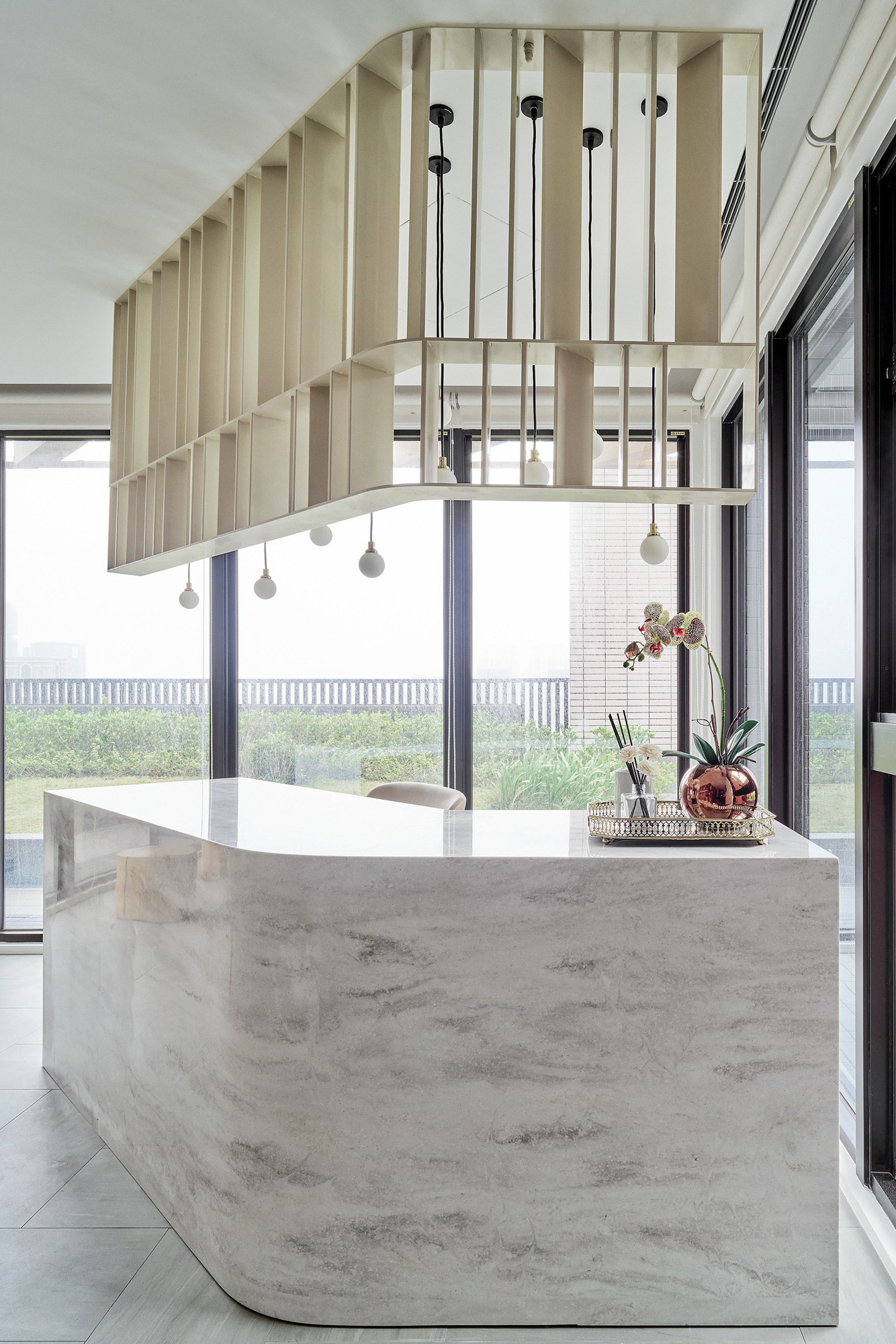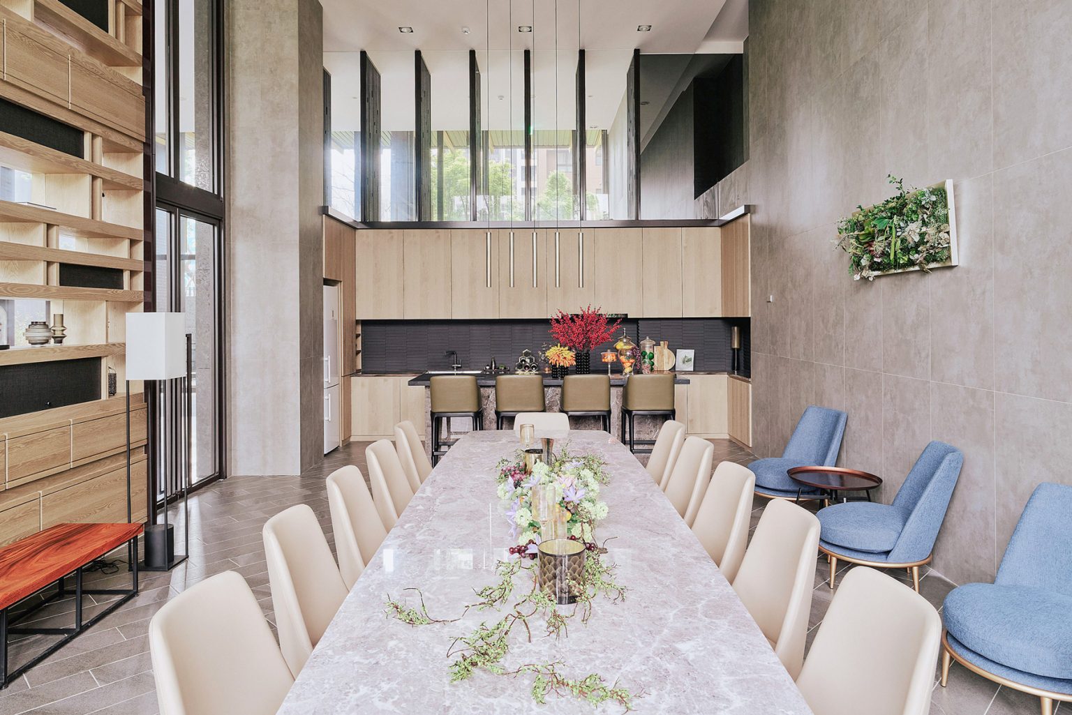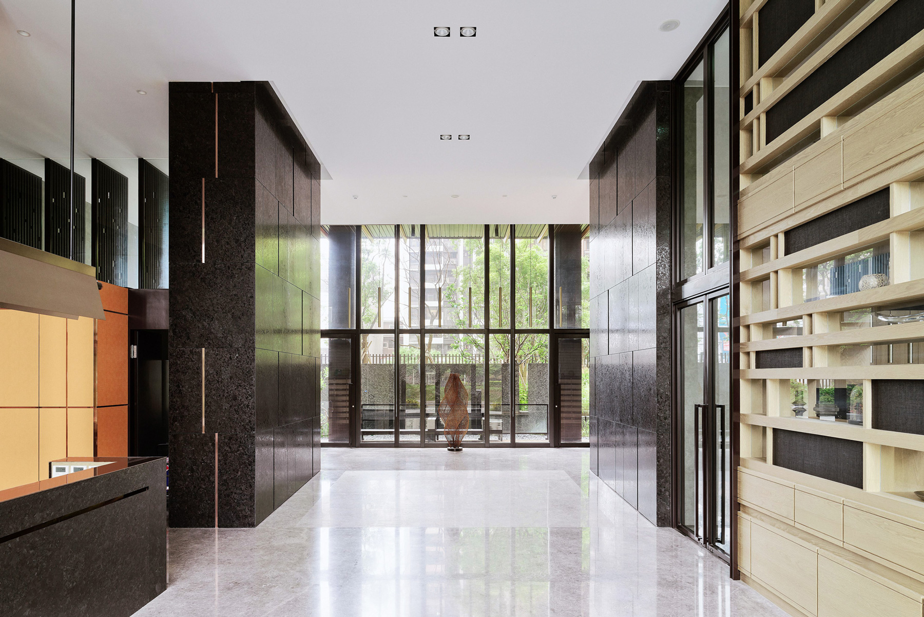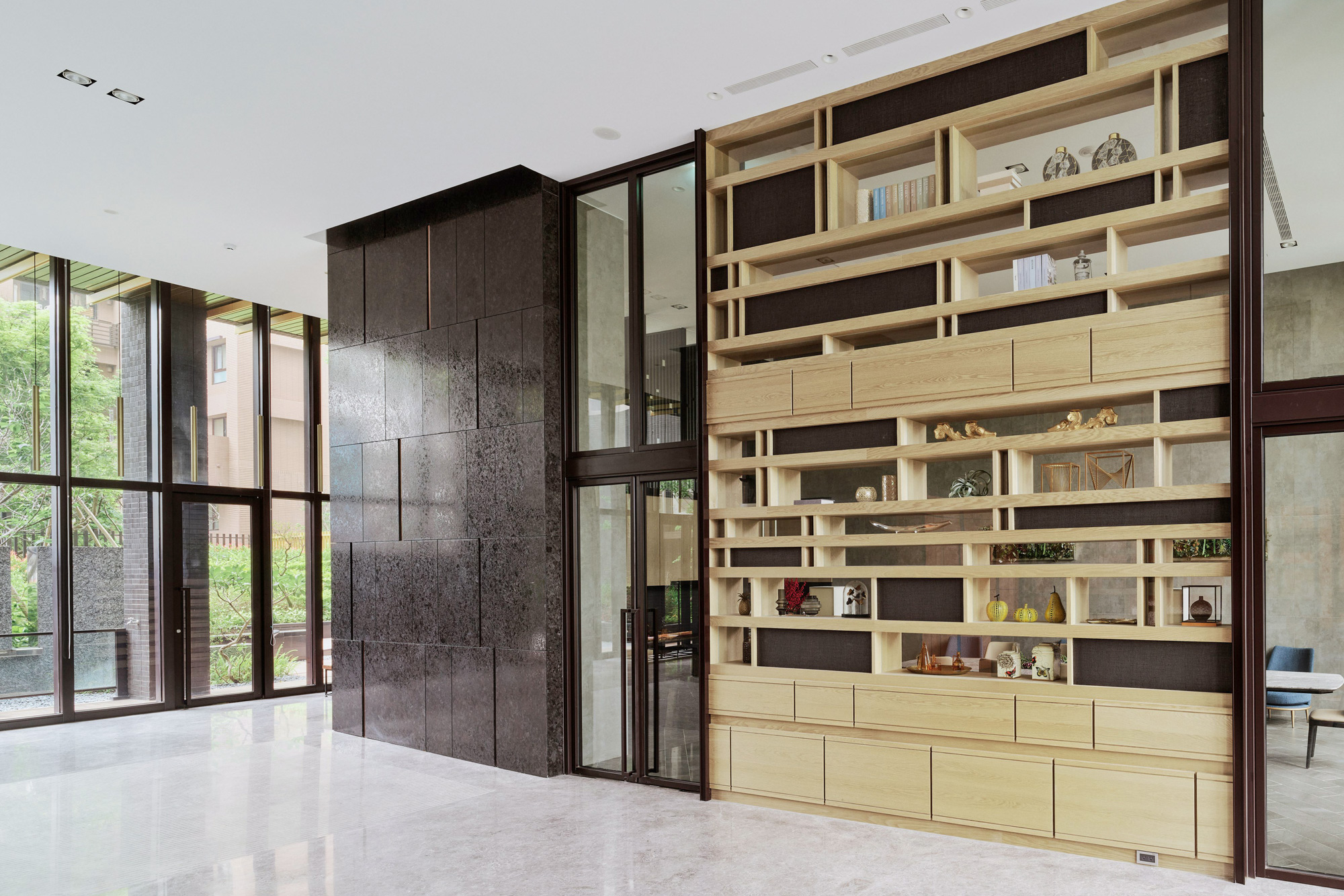 水秀室內設計,延續「林蔭之城」的建築概念——光線從樹影交錯之間穿透而來,延展視覺,展現空間層次。包括透空格柵的配置,引導自然光進入室內,形成明暗有序的空間節奏。藉由視線與動線的連續,綠意讓空間內外一體,彼此相映光輝,形塑社區共享與開放的生活型態。